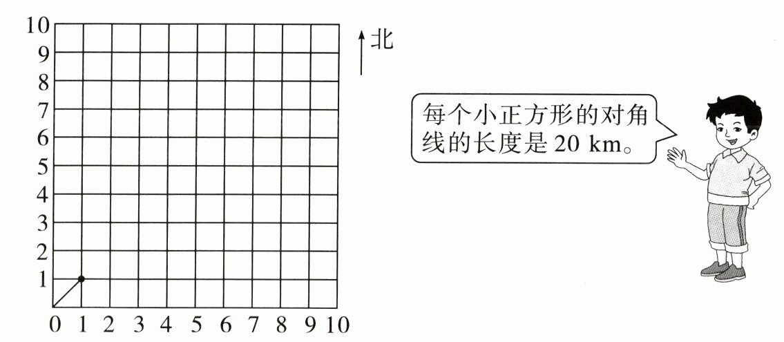 3. 如图,一艘潜水艇原来的位置是$(1,1)$,先向东偏北$45^{\circ}$方向行驶 60 km 到达(