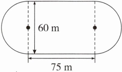 2. 如图,某校修建了一个配有塑胶跑道的运动场,两端是半圆形,中间是长 $ 75 \, m $、宽 $ 60 \, m $ 的长方形,这个运动场的占地面积是多少平方米?