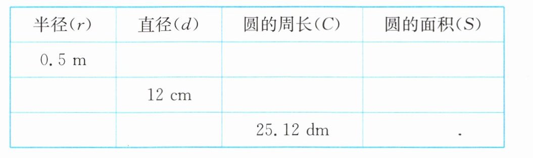 1 m 3.14 m 0.785 $m^{2}$ 6 cm 37.68 cm 113.04 $cm^{2}$ 4 dm 8 dm 50.24 $dm^{2}$