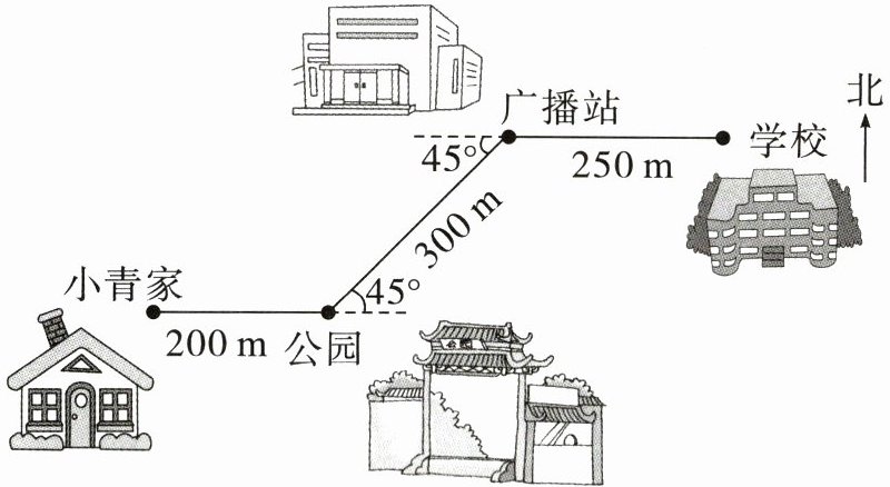 回家路线:小青从学校出发向正西方向走250 m到广播站,再向西偏南45°方向走300 m到公园,最后向正西方向走200 m到家。