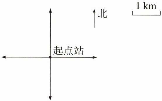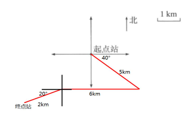 2. 125 路公交车从起点站出发向东偏南$40^{\circ}$方向行驶 5 km 后,再向西行驶 6 km,最后向西偏南$20^{\circ}$方向行驶 2 km 到达终点站。根据描述,把 125 路公交车行驶的路线图画完整。(8 分)