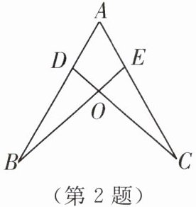2. 如图,点 $ D $,$ E $ 分别在线段 $ AB $,$ AC $ 上,$ CD $ 与 $ BE $ 相交于点 $ O $,已知 $ AB = AC $,则下列添加的条件中,仍不能判定 $ \triangle ABE \cong \triangle ACD $ 的是(