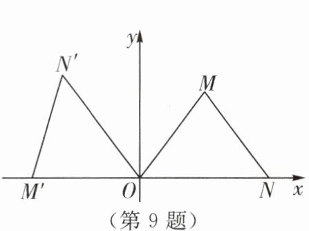 9. (2025·泰州海陵区校级月考)如图,在平面直角坐标系中,点 $ M $ 的坐标为 $ (3,4) $,点 $ N $ 的坐标为 $ (6,0) $,将 $ \triangle OMN $ 绕点 $ O $ 按逆时针方向旋转得到 $ \triangle OM'N' $。若点 $ M' $ 恰好落在 $ x $ 轴上,则点 $ N' $ 的坐标为______。