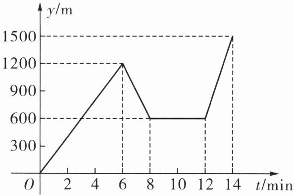 (4)由题意及图象知,0~6min时,平均速度为$\dfrac{1200}{6}=200(m/min)$,6~8min时,平均速度为$\dfrac{1200 - 600}{8 - 6}=300(m/min)$,12~14min时,平均速度为$\dfrac{1500 - 600}{14 - 12}=450(m/min)$.$\because 450>300>200$,$\therefore 12~14min$时速度最快,不在安全限度内.
