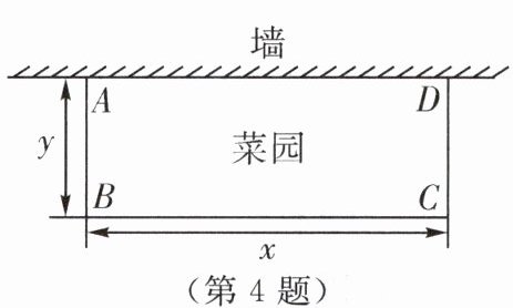4. (2024·如皋市期中改编)如图,有一块长方形菜园$ABCD$,一边利用足够长的墙,另三边用长度为$20\ m$的篱笆围成,设长方形的长$BC为x\ m$,宽$AB为y\ m$,则$y与x$之间的函数关系式是