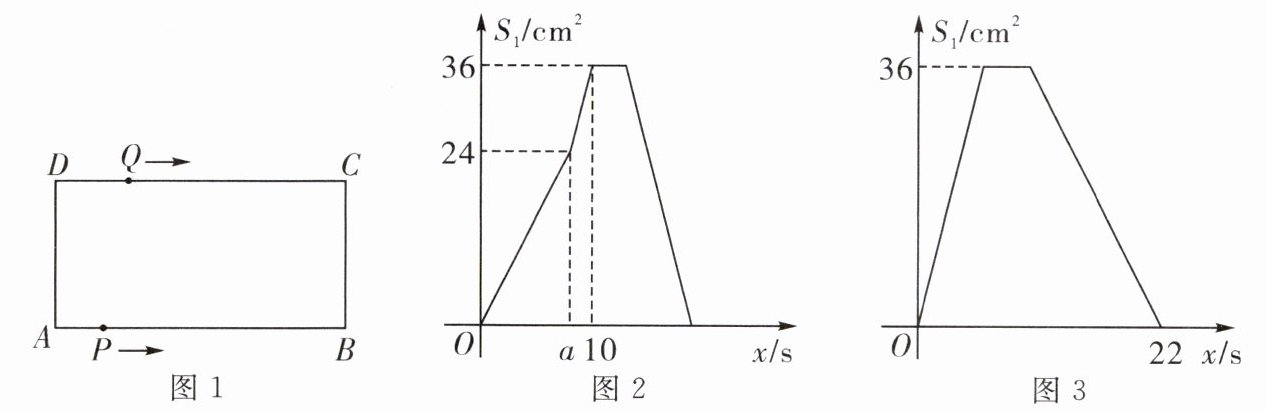 (1)由题意及题图2,得$S_{\triangle APD}=\dfrac{1}{2}PA\cdot AD=\dfrac{1}{2}(1\cdot a)\cdot6 = 24$,解得$a = 8$,$\therefore$点$P$变速前行驶的路程为$8×1 = 8(cm)$.由图2得,当$x = 10$时,$S_1 = 36 cm^2$.又$\because S_{\triangle ABD}=\dfrac{1}{2}AB\cdot AD = 36(cm^2)$,$\therefore$点$P$出发10s到点$B$,即点$P$出发10s时的路程为12cm,$\therefore 8×1+(10 - 8)b = 12$,解得$b = 2$.$\because$点$Q$变速前行驶的路程为$2×8 = 16(cm)$,$\therefore$点$Q$变速后行驶的路程为$12 + 6 + 12 - 16 = 14(cm)$.由题意及图3得,点$Q$变速后的行驶时间为$22 - 8 = 14(s)$,$\therefore 14c = 14$,解得$c = 1$.综上可知,$a$的值为8,$b$的值为2,$c$的值为1.
