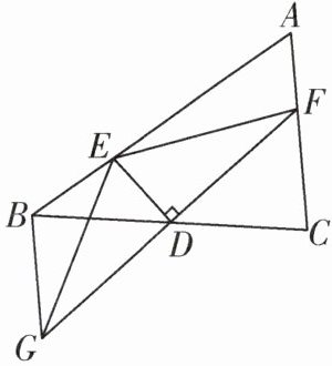 13. 如图,在 $ \triangle ABC $ 中,$ D $ 是 $ BC $ 的中点,过点 $ D $ 的直线 $ GF $ 交 $ AC $ 于点 $ F $,交 $ AC $ 的平行线 $ BG $ 于点 $ G $,$ DE \perp DF $,交 $ AB $ 于点 $ E $,连接 $ EG $,$ EF $。请你判断 $ BE + CF $ 与 $ EF $ 的大小关系,并说明理由。