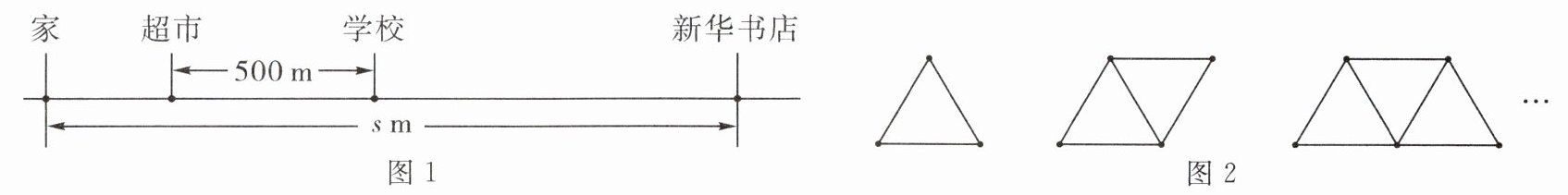 (4)如图1,小明从家按 $ 70\ m/min $ 的速度匀速走了 $ 5\ min $ 到达超市,接着从超市步行到学校拿遗落的书.由于走累了,就开了一个共享单车,按 $ 300\ m/min $ 的速度匀速骑车到新华书店买书.小明离开家的距离 $ s(m) $ 随骑行时间 $ t(min) $ 的变化而变化;