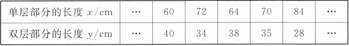 14. (2024 • 成都双流区期末改编)小明一家计划寒假外出旅游,为此,妈妈为小明准备了一个带有挎带的保温水杯,如图所示,水杯的挎带由双层部分、单层部分和调节扣构成,通过调节扣加长或缩短单层部分的长度,可以使挎带的长度(单层部分与双层部分长度的和,其中调节扣所占的长度忽略不计)加长或缩短. 经测量单层部分的长度 $ x ( cm ) $ 与双层部分的长度 $ y ( cm ) $,得到如下表格中数据: