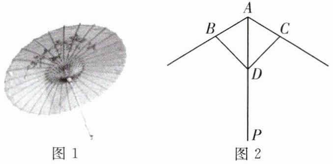 6. (2024·泗洪县期中)如图1,油纸伞是中国传统工艺品之一,起源于中国的一种纸制或布制伞.油纸伞的制作工艺十分巧妙,如图2,伞圈$D沿着伞柄AP$滑动时,总有伞骨$BD= CD$,$AB= AC$,从而使得伞柄$AP始终平分同一平面内两条伞骨所成的\angle BAC$.请你说明其中的理由.