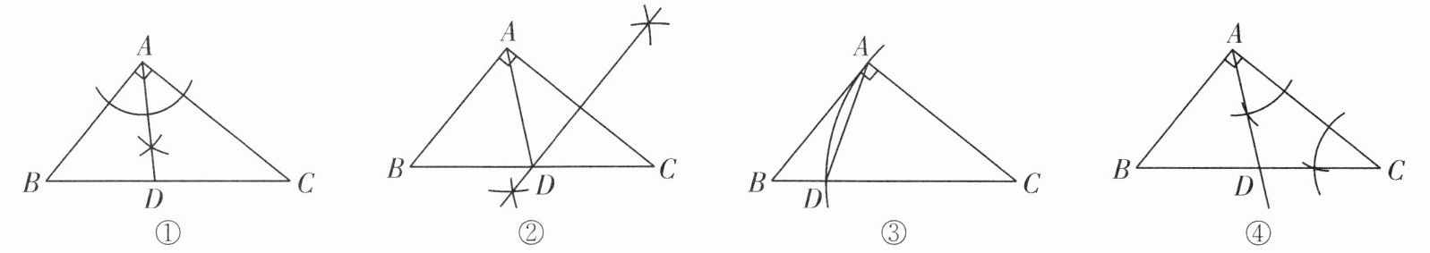 3. 在$\triangle ABC$中,$\angle BAC= 90^{\circ}$,$AB\neq AC$。用无刻度的直尺和圆规在边$BC上找一点D$,使$\triangle ACD$为等腰三角形。下列作法正确的是
