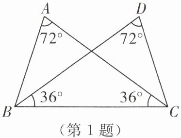 1. (2024·常熟市校级月考)如图,$\triangle ABC和\triangle DCB$中,$\angle A= \angle D= 72^{\circ}$,$\angle ACB= \angle DBC= 36^{\circ}$,则图中等腰三角形的个数是(