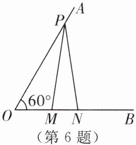 6. (2024·宿迁宿城区期中)如图,已知$\angle AOB = 60°$,点 $P$ 在边 $OA$ 上,$OP = 8\ cm$,点 $M$,$N$ 在边 $OB$ 上,$PM = PN$,若 $MN = 2\ cm$,则 $OM = $
