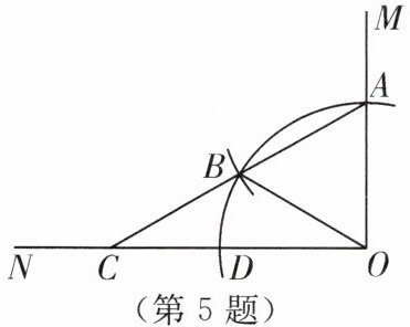 5. (2024·连云港赣榆区期中)如图,$\angle MON = 90°$,以点 $O$ 为圆心,任意长为半径画弧,分别交 $OM$,$ON$ 于点 $A$,$D$,再以点 $A$ 为圆心,$AO$ 长为半径画弧,与弧 $AD$ 交于点 $B$,连接 $OB$,$AB$,$AB$ 的延长线交 $ON$ 于点 $C$,若 $OD = 4$,则 $CB$ 的长为______