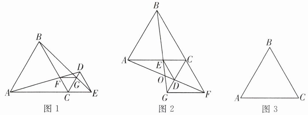 自主探究:若$\triangle ABC和\triangle CDE$在直线 $AC$ 的异侧,其余条件不变,如图2所示,$AD$ 与 $BC$ 的延长线交于点 $F$,$BE$ 与 $CD$ 的延长线交于点 $G$,$AF$ 与 $BG$ 交于点 $O$,连接 $GF$.