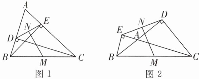 13. (2024·江阴市期中)如图1,在锐角三角形$ABC$中,$CD,BE分别是边AB,AC$上的高,$M,N分别是线段BC,DE$的中点.