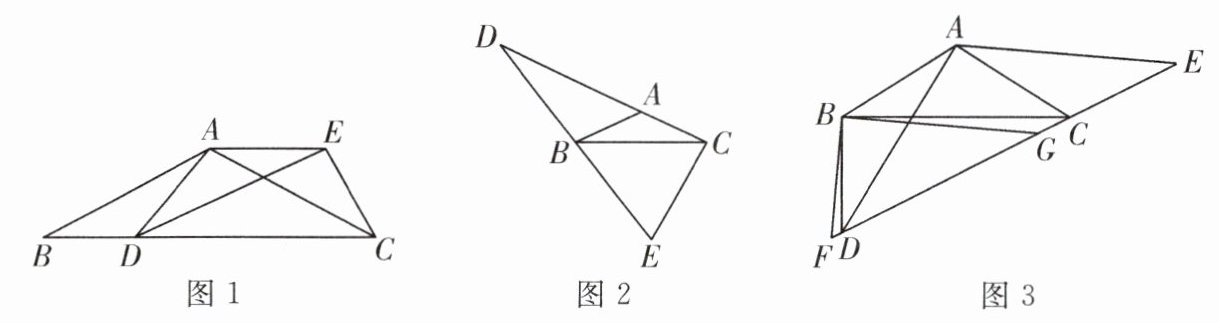 (3)如图3,$∠GBF= 90^{\circ}$,$∠E= \alpha$,$AD= AE$,$CE= m$,$AE// BG$,点$F,D,G,C,E$在同一直线上,求$FG$的值.(用含$m$的式子表示)