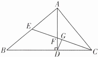 13. (2024·无锡新吴区期中)如图,在 $\triangle ABC$ 中,$AD$ 是边 $BC$ 上的高线,$CE$ 是边 $AB$ 上的中线,$AD$ 与 $CE$ 交于点 $F$,点 $G$ 为 $CE$ 的中点,$CD = AE$。