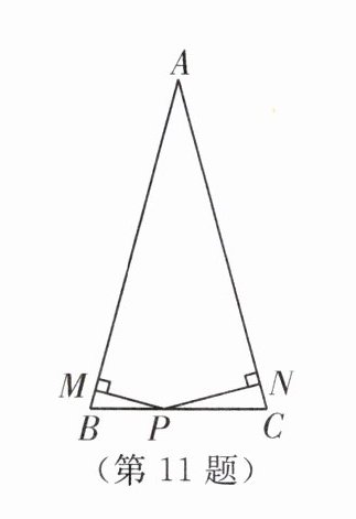 11. (2024·如东县期中)如图,$\triangle ABC$ 中,$AB = AC = 4$,$\angle A = 30^{\circ}$,$P$ 是 $BC$ 上任意一点,$PM \perp AB$于点 $M$,$PN \perp AC$ 于点 $N$,则 $PM + PN$ 的值为______。