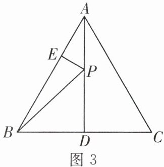模型应用:(1)如图 3,在等边三角形 ABC 中,E 是 AB 上的动点,AD 是 $ \angle BAC $ 的平分线,P 是 AD 上的动点. 若 $ AD = 6 $,则 $ PE + PB $ 的最小值为______.