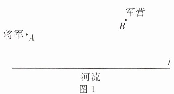 材料 2:唐朝诗人李颀的诗《古从军行》开头两句说“白日登山望烽火,黄昏饮马傍交河”,这句诗让我们想到了著名的“将军饮马”问题:如图 1,将军从 A 地出发到河流 l 饮马,然后再到 B 地军营视察,怎样走路径最短?