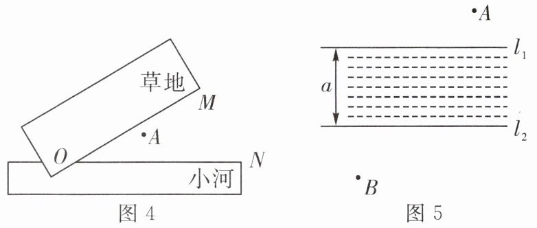 拓展延伸:(3)如图 5,A,B 两村之间有一条两岸互相平行的河,河宽为 a. 现要在河上造一座桥(桥必须与河岸垂直),使 A,B 之间的路程最短,试画出造桥位置.