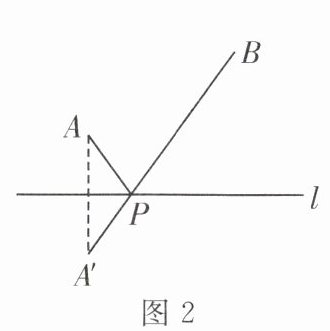 解法:作点 A 关于直线 l 的对称点 $ A' $,连接 $ A'B $ 交 l 于点 P,则点 P 即为所求. 此时,$ PA + PB $ 的值最小,且 $ PA + PB = A'P + PB = A'B $.