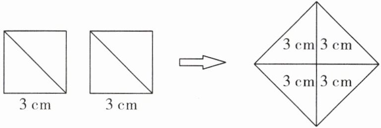 7. 若小明想将两块边长都为$3\mathrm{cm}$的正方形纸板沿对角线剪开,拼成如图所示的一个大正方形,请你帮他求出这个大正方形的面积.它的边长是整数吗?若不是整数,则请你估计这个边长的值在哪两个整数之间.