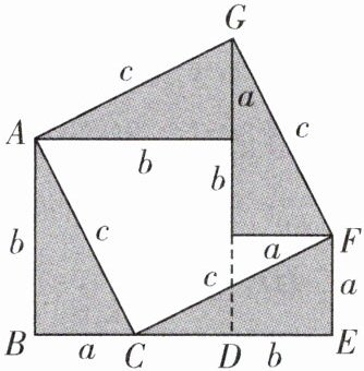 方法二:$S_{五边形ABEFG}=S_{正方形ACFG}+S_{\triangle ABC}+S_{\triangle CEF}=c^{2}+\frac{1}{2}ab+\frac{1}{2}ab=c^{2}+ab$,
