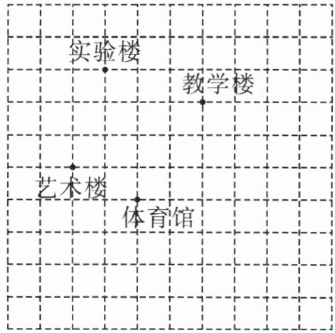 5. (2024·镇江市期末改编)如图是某校的平面示意图,图中的小方格都是边长为1个单位长度的正方形,建立平面直角坐标系,得到体育馆的坐标为$(-2,-1)$,艺术楼的坐标为$(-4,0)$,教学楼和实验楼的位置都在格点上。