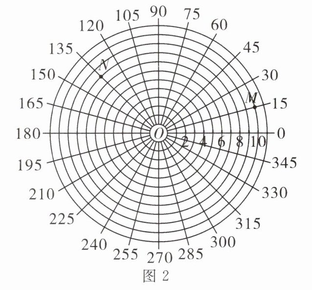 还有一种方法广泛应用于航海、航空、气象、军事等领域。如图2,在红星镇所建的雷达站O的雷达显示屏上,把周角每$15^{\circ}$分成一份,正东方向为$0^{\circ}$,相邻两圆之间的距离为1个单位长度(1单位长度表示的实际距离为1km),现发现2个目标,我们约定用$(10,15^{\circ})$表示点M在雷达显示器上的坐标,则:
