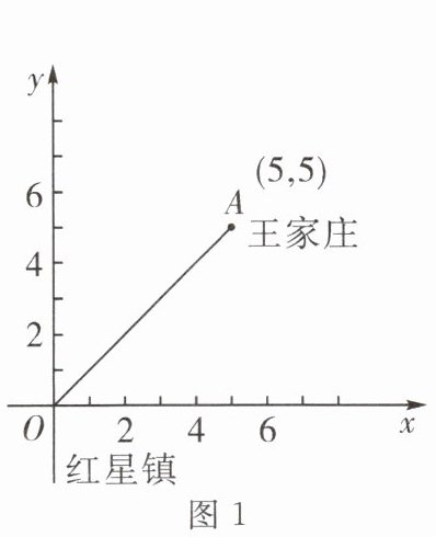 8. 在向红星镇居民介绍王家庄位置的时候,我们可以这样说,如图1,在以红星镇为原点,正东方向为x轴正方向,正北方向为y轴正方向的平面直角坐标系(1单位长度表示的实际距离为1km)中,王家庄的坐标为$(5,5)$;也可以说,王家庄在红星镇东北方向$5\sqrt{2}$km的地方。