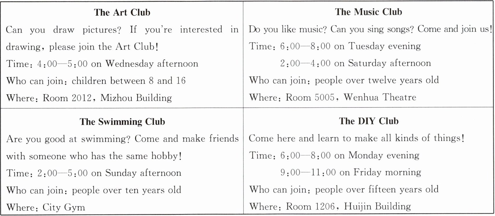 )4. Which club is open on Sunday afternoon?A. The Music Club.