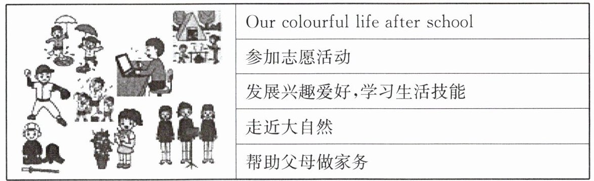 随着“双减”政策的实施,初中生有着更多姿多彩的课外生活。你校英文报刊以“我们丰富的课外生活”为主题开展征文活动。请根据以下表格内容提示,以“Our colourful life after school”为题,写一篇80词左右的英语短文介绍丰富多彩的课外生活,并推荐你最喜欢的一项活动且说明原因。