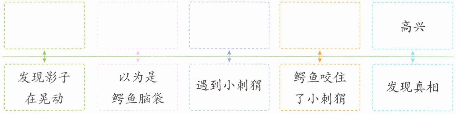 (1)示例:小刺猬发现了鳄鱼头的秘密,原来"鳄鱼头"是树上风筝的影子,小兔和小刺猬都松了一口气。