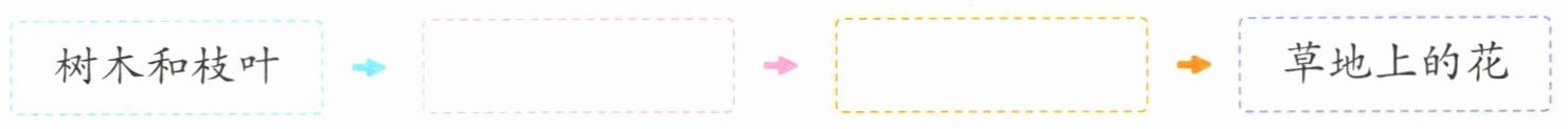 ,树木长得葱葱茏茏,密密层层的枝叶把森林封得严严实实的,挡住了人们的视线,遮住了蓝蓝的天空。早晨,雾从山谷里升起来,整个森林浸在乳白色的浓雾里。太阳出来了,千万缕耀眼的金光穿过树梢,照射在工人宿舍门前的草地上。草地上盛开着各种各样的野花,红的、白的、黄的、紫的,真像个美丽的大花坛。(1) 片段开头的横线上应填写的季节是____。阅读片段,按照描写顺序填一填。