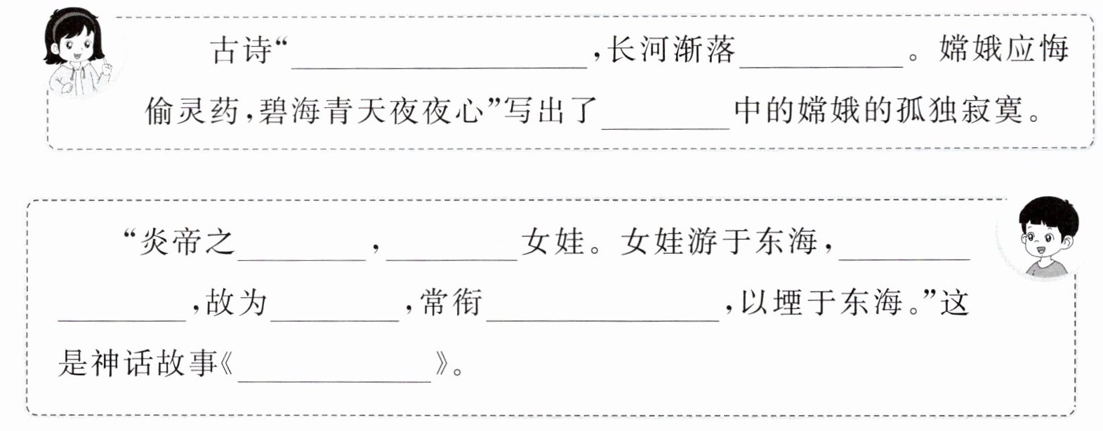 3. 讲神话传说古诗文中也有动人的神话传说,请根据积累补全对话。