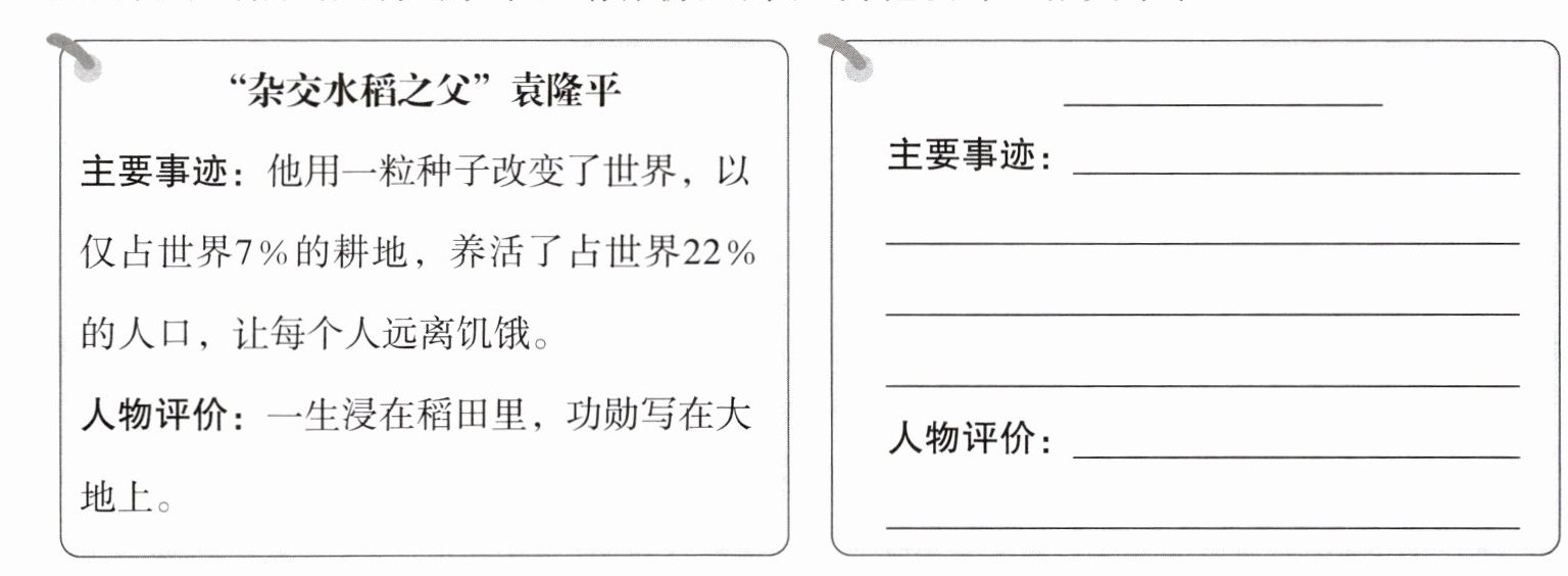 (3) 为了“吾国万疆”,无数人用“一万个日常”,痴心钻研,默默奉献。你知道哪些为国家富强而奋斗的杰出人物的故事?请你仿照例子,为他设计一张英雄卡。