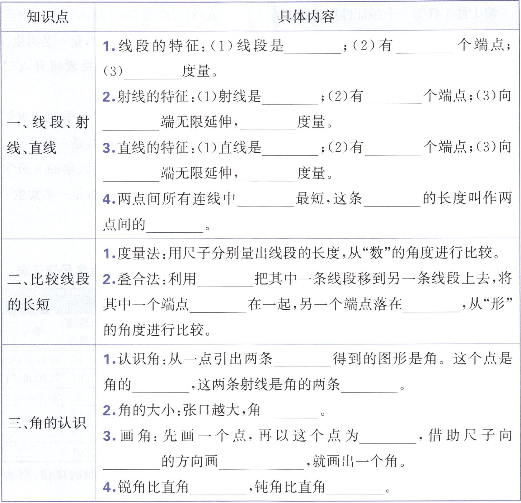 (3)两 不可 4.线段 线段 距离 二、2.圆规 重合 同一侧 三、1.射线 顶点 边 2.越大 3.顶点 不同 两条射线 4.小 大