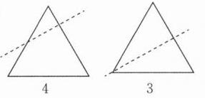 2. 把下面的三角形纸剪掉一个角,可能还剩几个角?用虚线表示剪法,画一画,数一数。