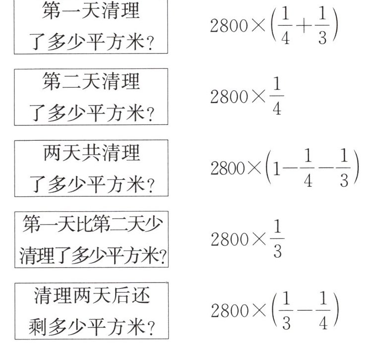 计划清理面积为 $2800 m^2$ 的人工湖底的污泥,第一天清理了 $\dfrac{1}{4}$,第二天清理了 $\dfrac{1}{3}$。