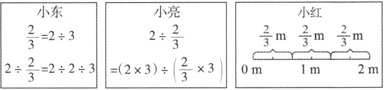 |$\dfrac{2}{3} = 2 ÷ 3$$2 ÷ \dfrac{2}{3} = 2 ÷ 2 ÷ 3$|$2 ÷ \dfrac{2}{3}$$= (2 × 3) ÷ (\dfrac{2}{3} × 3)$|0 m 1 m 2 m|