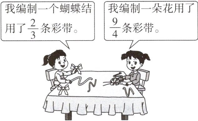 2. 一种彩带每条长$2.4$ m,两名同学分别用这种彩带编制蝴蝶结和花。请根据她们的对话计算编制一朵花比编制一个蝴蝶结多用多少米彩带。
