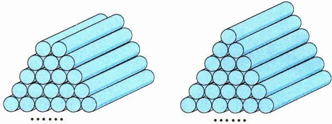 3. 借助梯形的面积公式可以快速计算出图中左边这堆木头的根数。受此启发,佳佳觉得如果再在上面加一根木头,就可以借助三角形的面积公式计算:$(a×h÷2)$根。($a$为最下层的根数,$h$为层数)