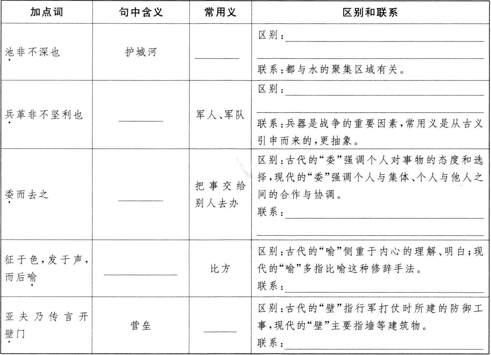 3. 第一小组比较了下列加点词的句中含义与它们在现代汉语中的常用义,并找出了它们之间的区别和联系,请你和他们一起把表格补充完整。