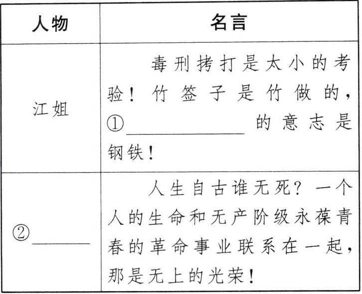 (4) 《红岩》刻画了一批意志坚定、形象高大的共产党员形象,下面是人物的名句集锦,请填出对应的信息。(2分)