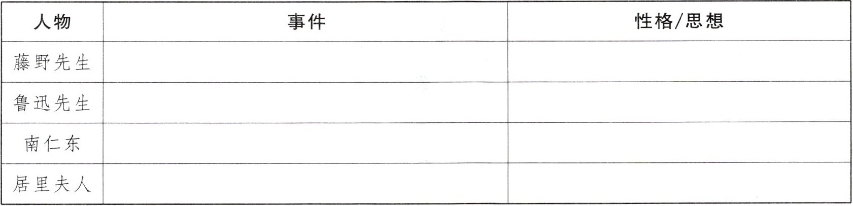 1. 假如你是班级文学专刊负责人物传记版块的编辑,需要为以下四位人物建立"事件素材库"。请从课文中各选取一个典型事件,并说明这些事件分别体现了人物怎样的思想或性格。