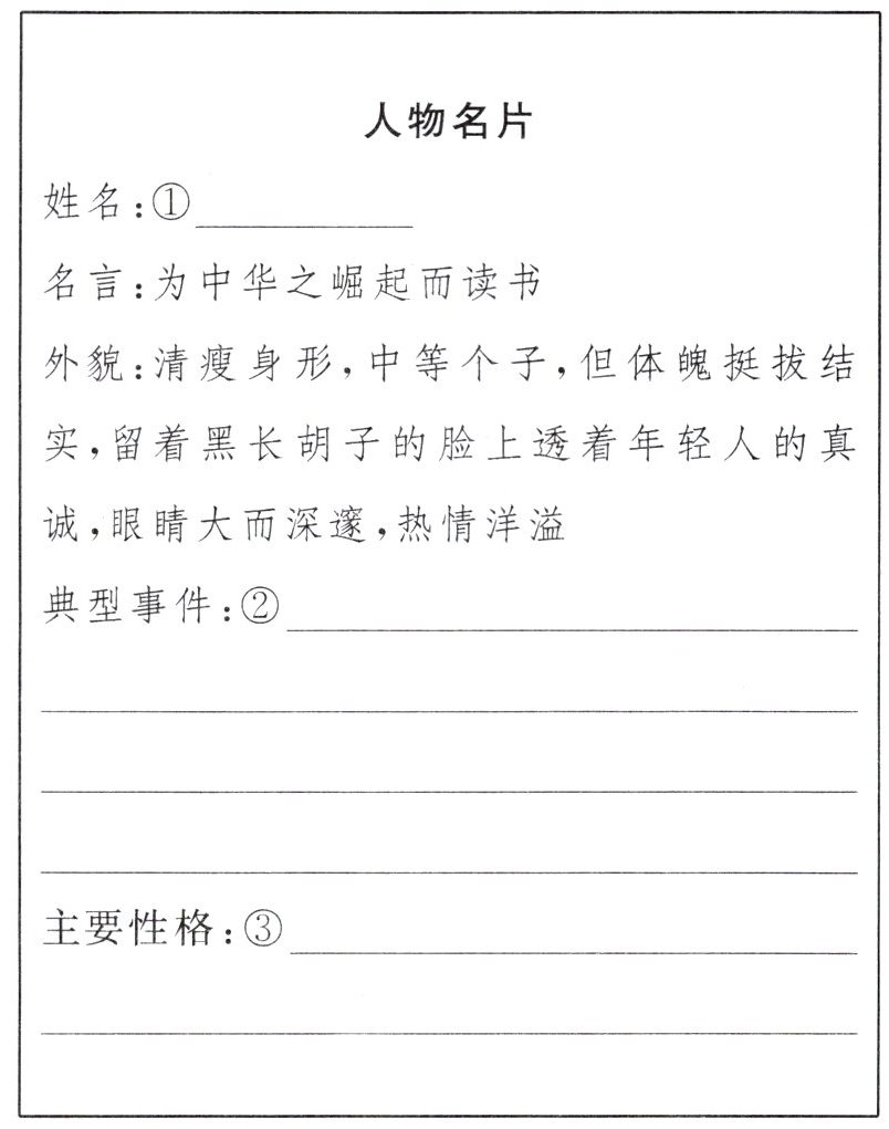 2. 阅读名著,我们要学会整理人物的主要信息。请根据名著《红星照耀中国》完成下面的人物名片。