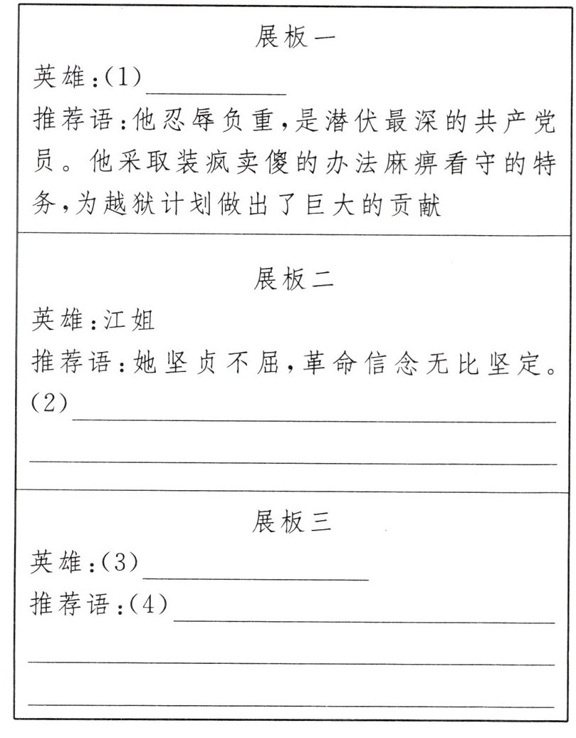 1. 《红岩》是一部用烈士鲜血写成的英雄史诗,书中塑造了众多革命战士的英雄群像,请你为“红岩馆”补充完善以下三块展板的内容。