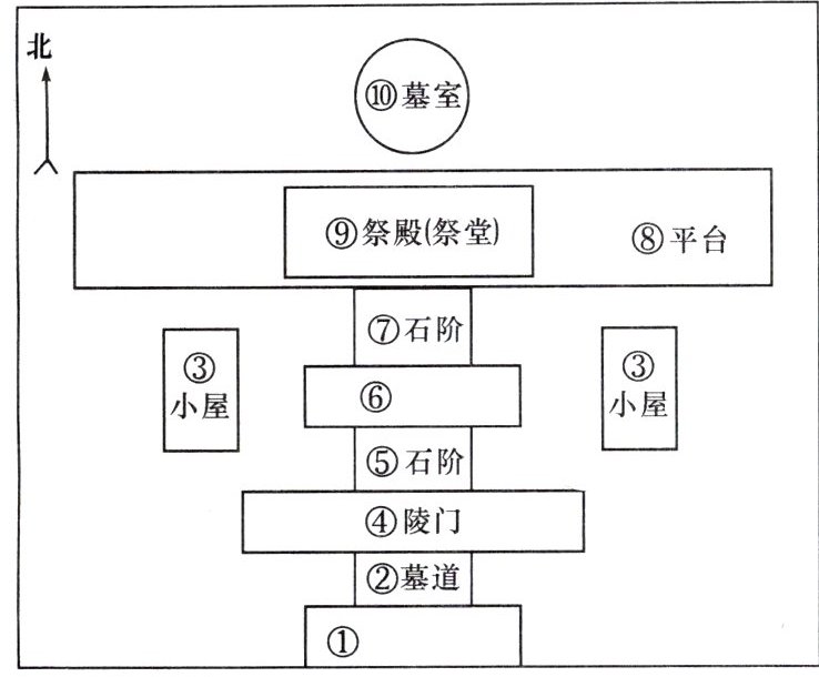 ①石牌坊 ⑥碑亭 说明顺序:空间顺序(由外而内、由总体到局部)。解说:陵墓的入口位于最南端,是一座三间三楼琉璃瓦顶的石牌坊。石坊北是一条缓长的墓道,墓道北端有一倾斜台地,东、西侧各有一个面阔三间的小屋。墓道正面是陵门,穿过陵门后的石阶就可以到达碑亭。自碑亭再北,地势陡然高峻,由此上石阶,石阶尽处是一个大平台,中央矗立着陵园的主体建筑——祭殿(祭堂)。祭堂是宽30米、深24.7米、高28.7米的重檐歇山建筑。它在整个陵园建筑中体量最大,等级最高。祭堂后面便是高8.4米,直径13.7米的墓室。
